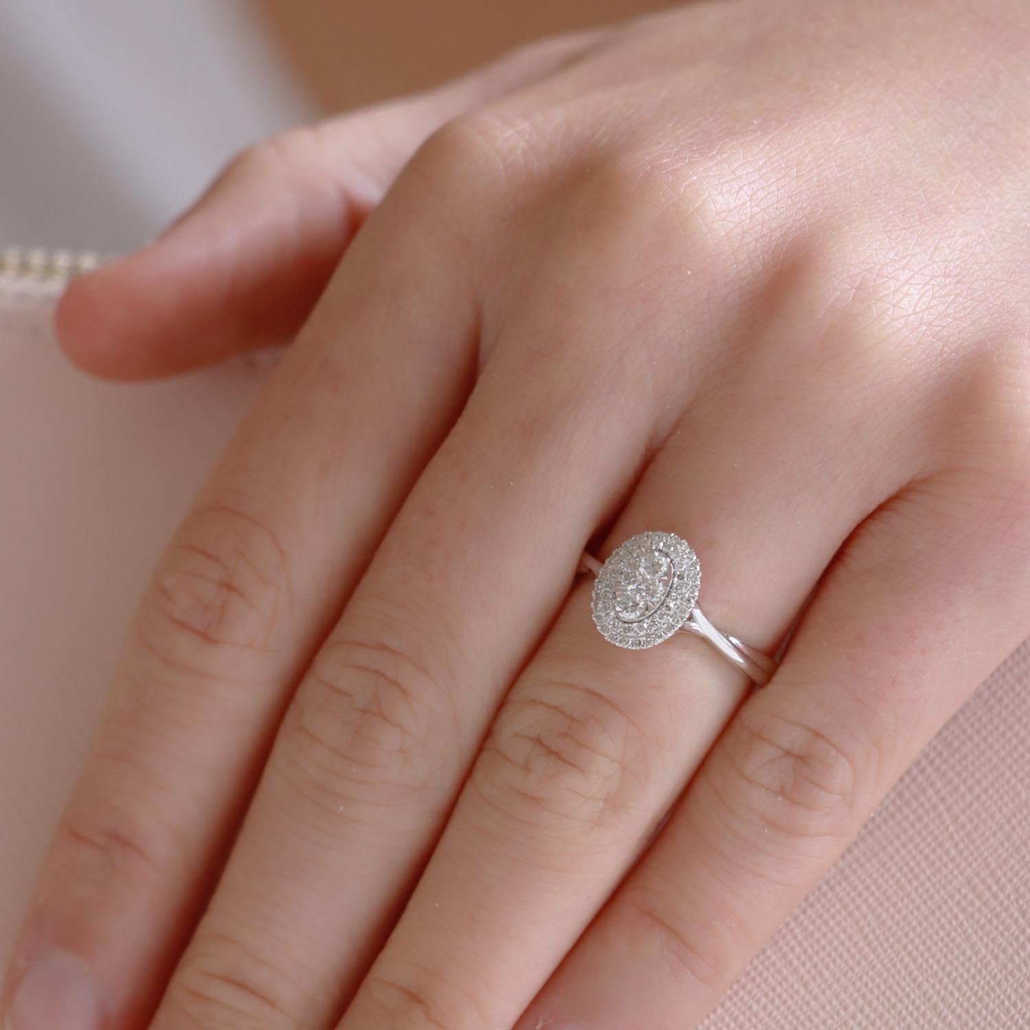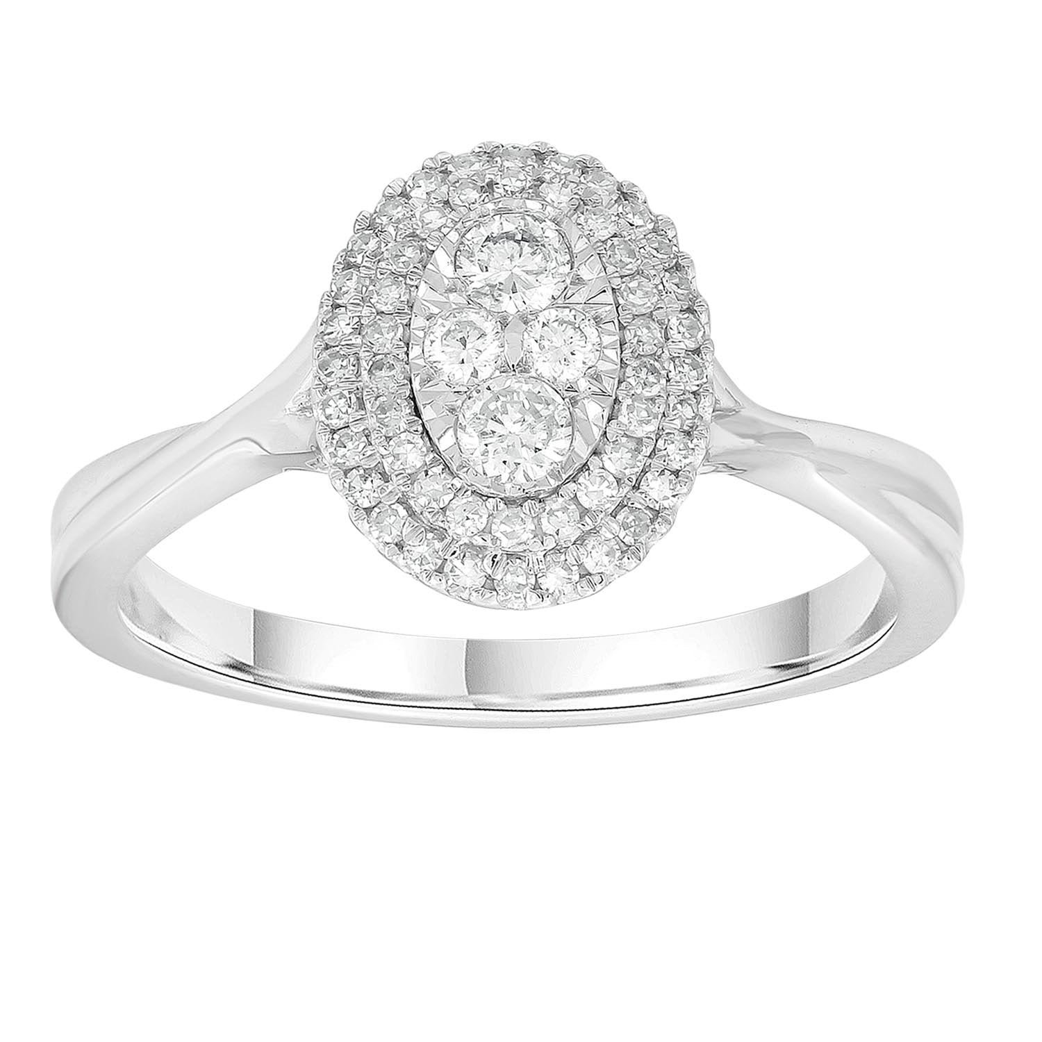 Pop the question with this stunning diamond cluster engagement ring featuring 54 diamonds, a total diamond weight of 0.30 carats set in 9K white gold.