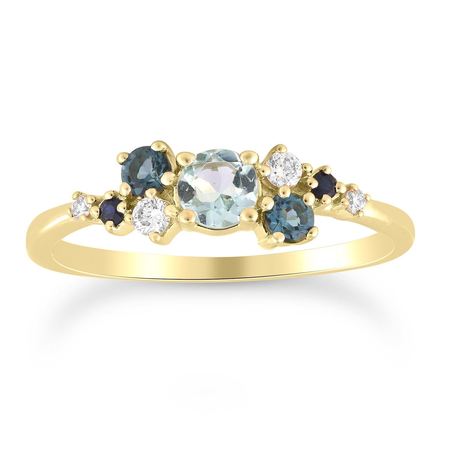 Simply beautiful, this Diamond and Aquamarine Ring with 0.08ct Diamonds in 9K Yellow Gold features 9 dazzling diamonds for an absolutely stunning look. Polished with an elegant shine, pair this with a matching Yellow gold accessory for the ultimate look.