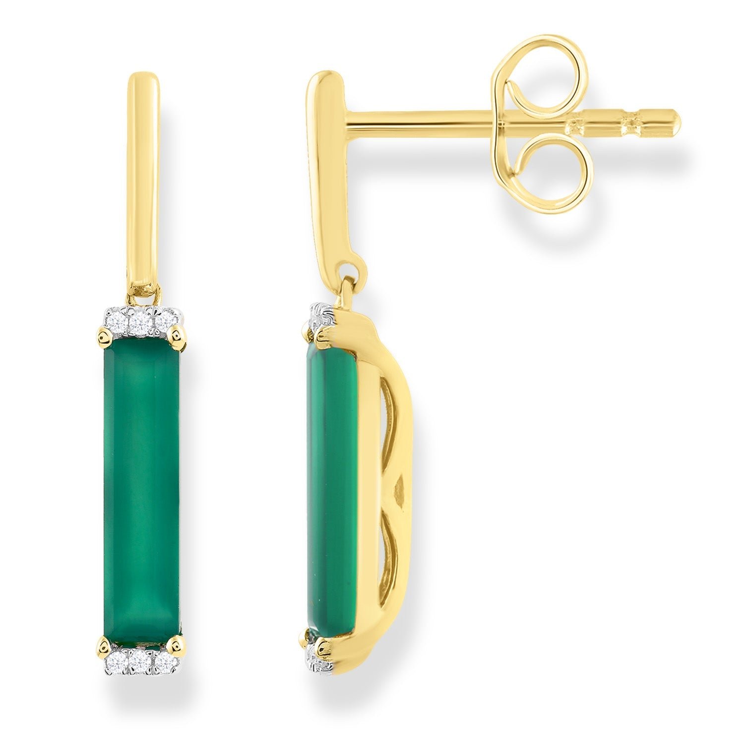 Simply beautiful, this Diamond and Green Onyx Drop Earrings with 0.05ct Diamonds in 9K Yellow Gold features 14 dazzling diamonds for an absolutely stunning look. Polished with an elegant shine, pair this with a matching Yellow gold accessory for the ultimate look.