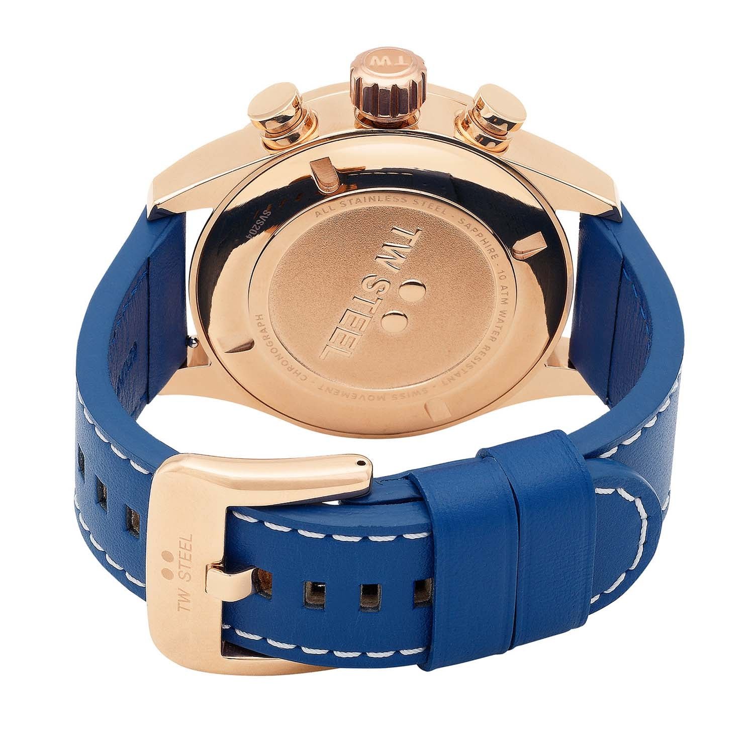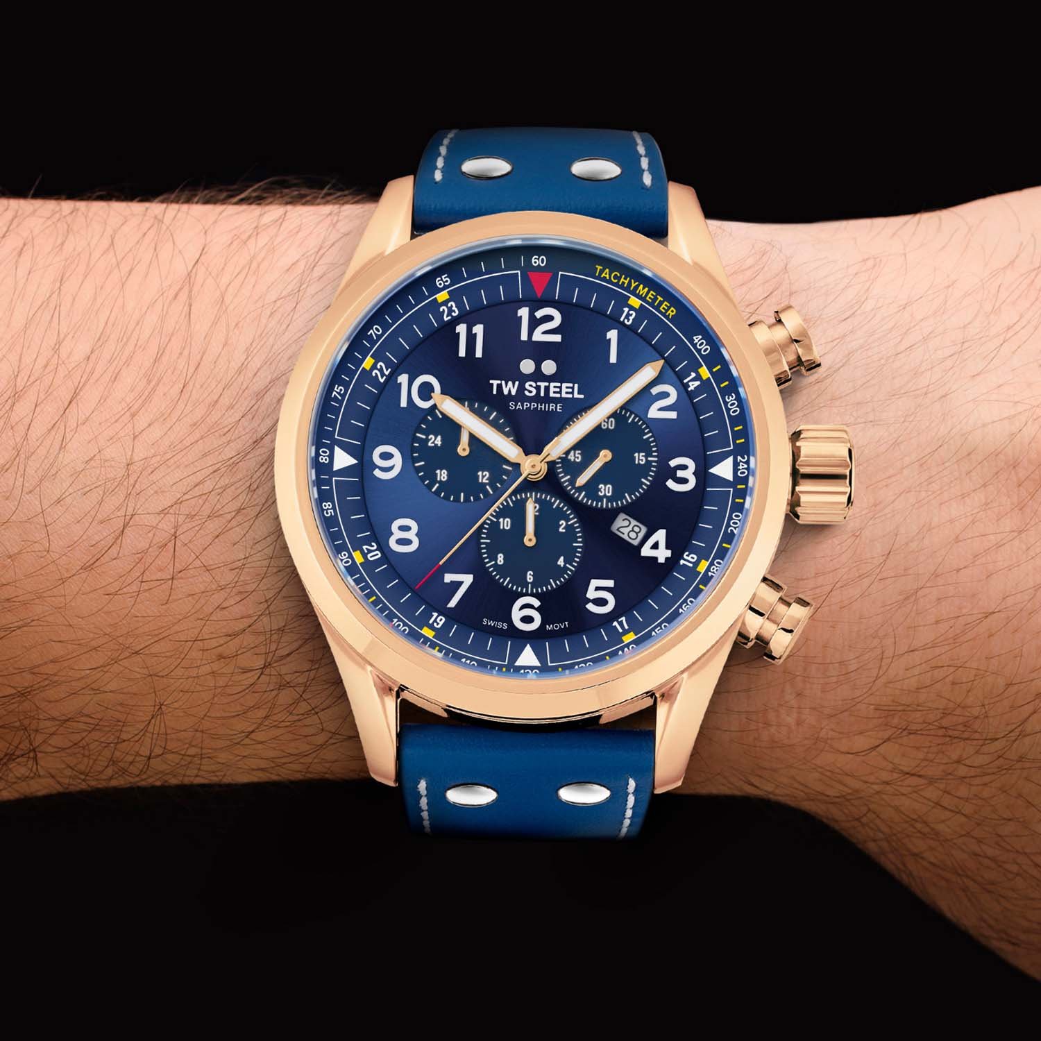 Forget the destination, live the journey.This Swiss Volante model features a 48mm shiny PVD rose gold plated steel case with sapphire crystal and a sunray blue dial. It is powered by a Swiss made chronograph movement and stands out with a blue, Italian calf leather strap.