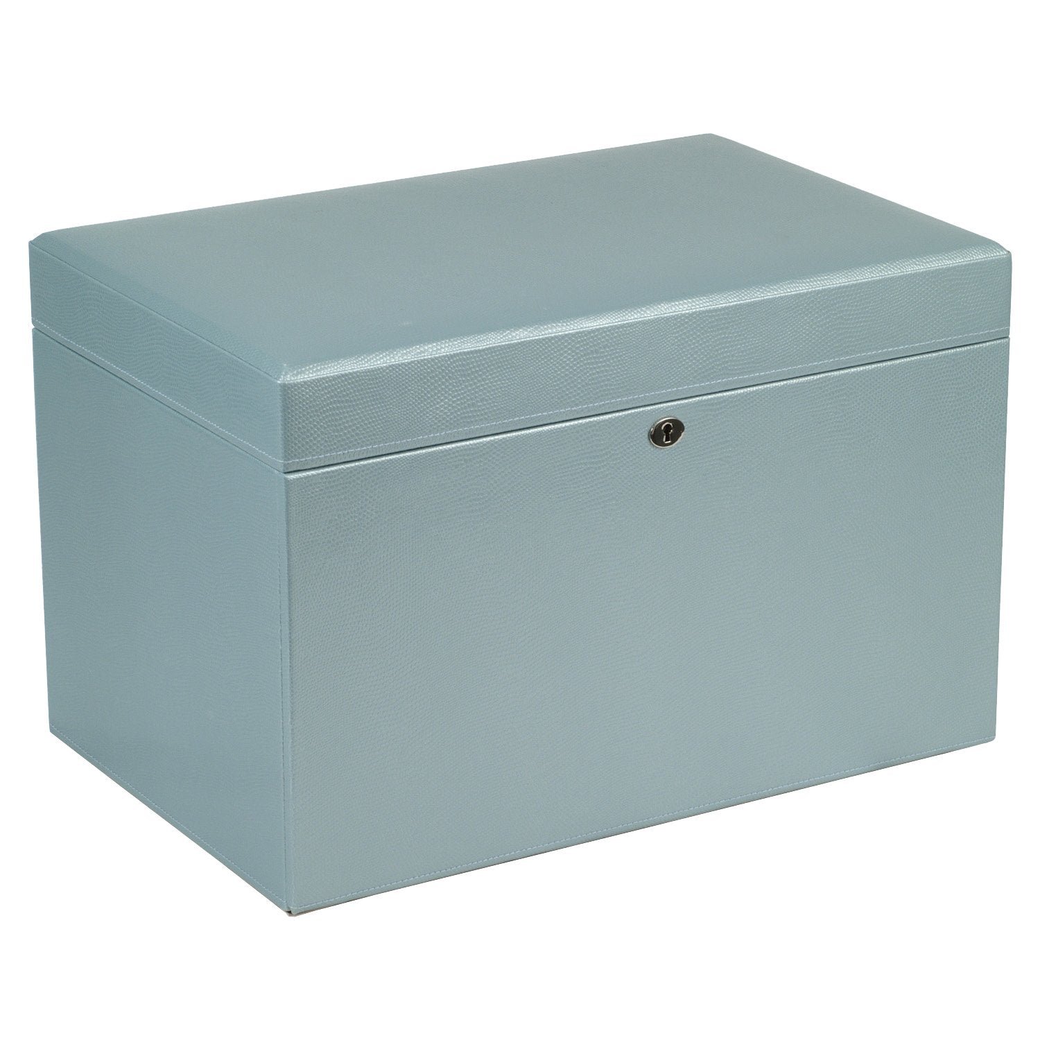 A WOLF classic for over 10 years, London embodies the tradition of box-making, the style that is timeless and the simple delight of organizing our treasures. The large jewellery box includes ice lizard embossed leather, glass mirror, chrome fittings, and lock and key. Lined with our patented LusterLoc, London absorbs the hostile gases known to cause tarnishing for up to 35 years.