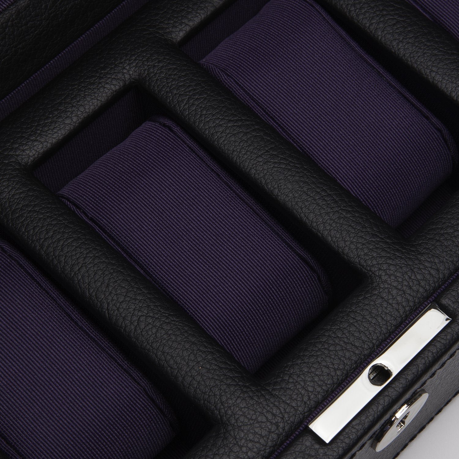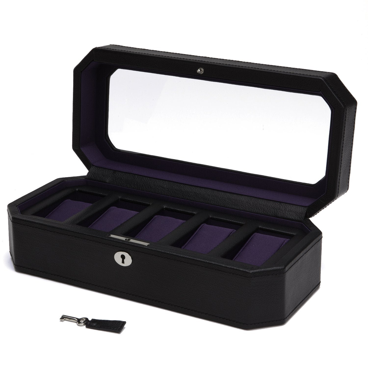 Retro shapes and colours make Windsor a perfect companion for your timepieces. Display and organise your collection beautifully with the Windsor 5-piece watch box. Features chrome finished hardware, locking glass cover, smooth vegan leather, purple textured silk lining and 5-piece watch storage.