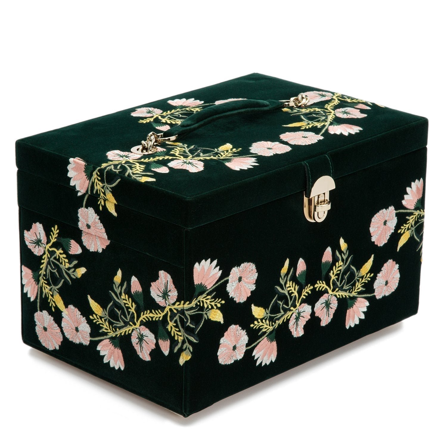 Fresh faced and fun, Zoe is sophisticated but playful. The Large case’s soft forest green body highly embroidered with classic floral designs is as beautiful as its accessories inside. Includes forest green velvet exterior, LusterLoc interior, pale gold hardware, and removable mini travel piece.