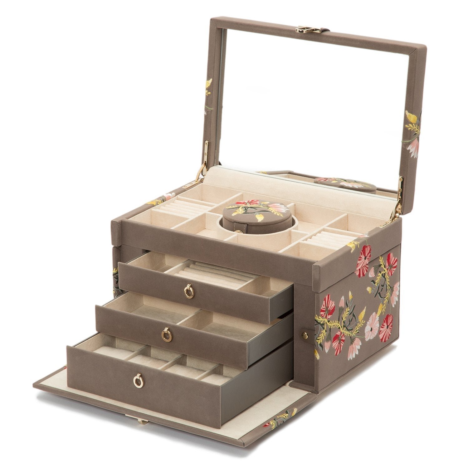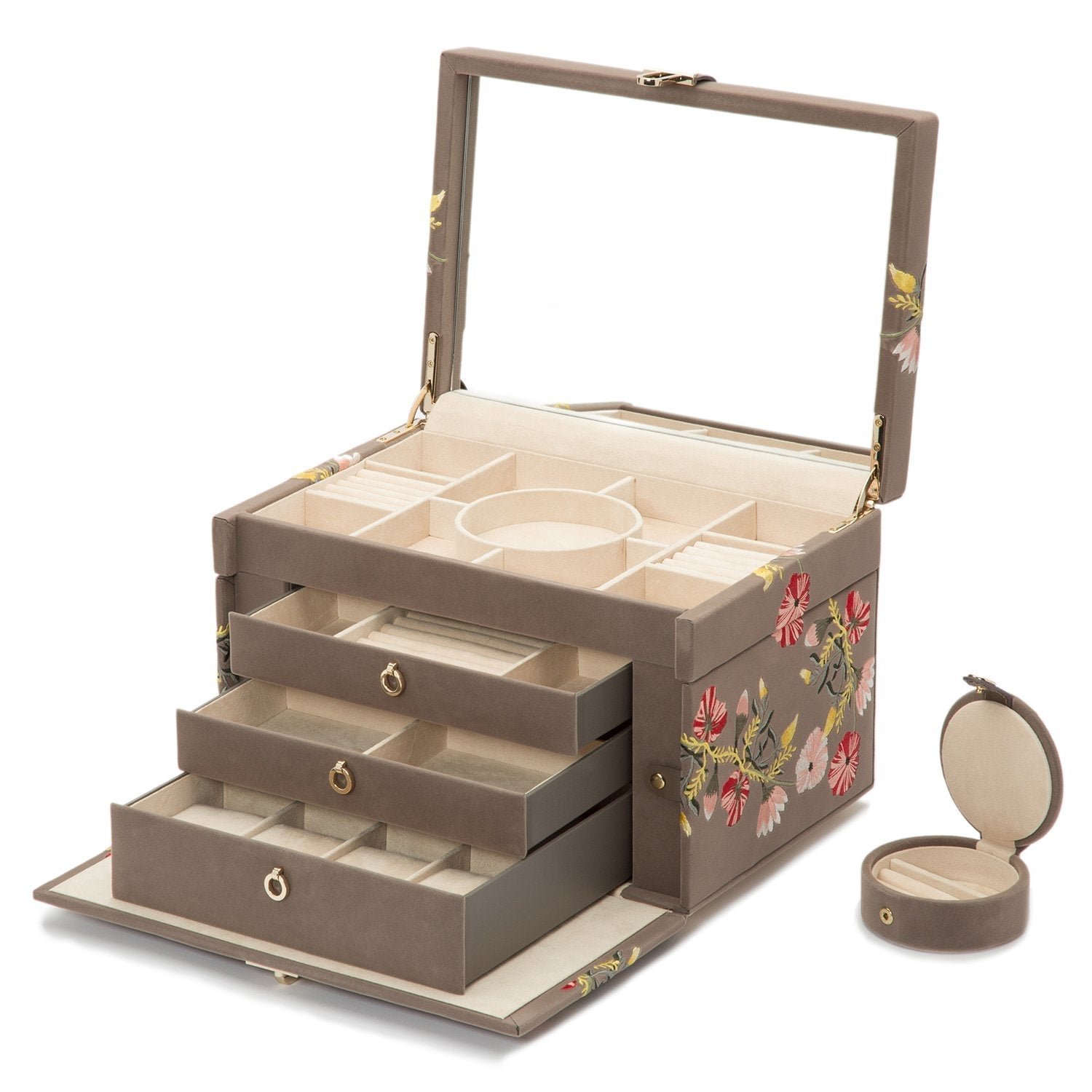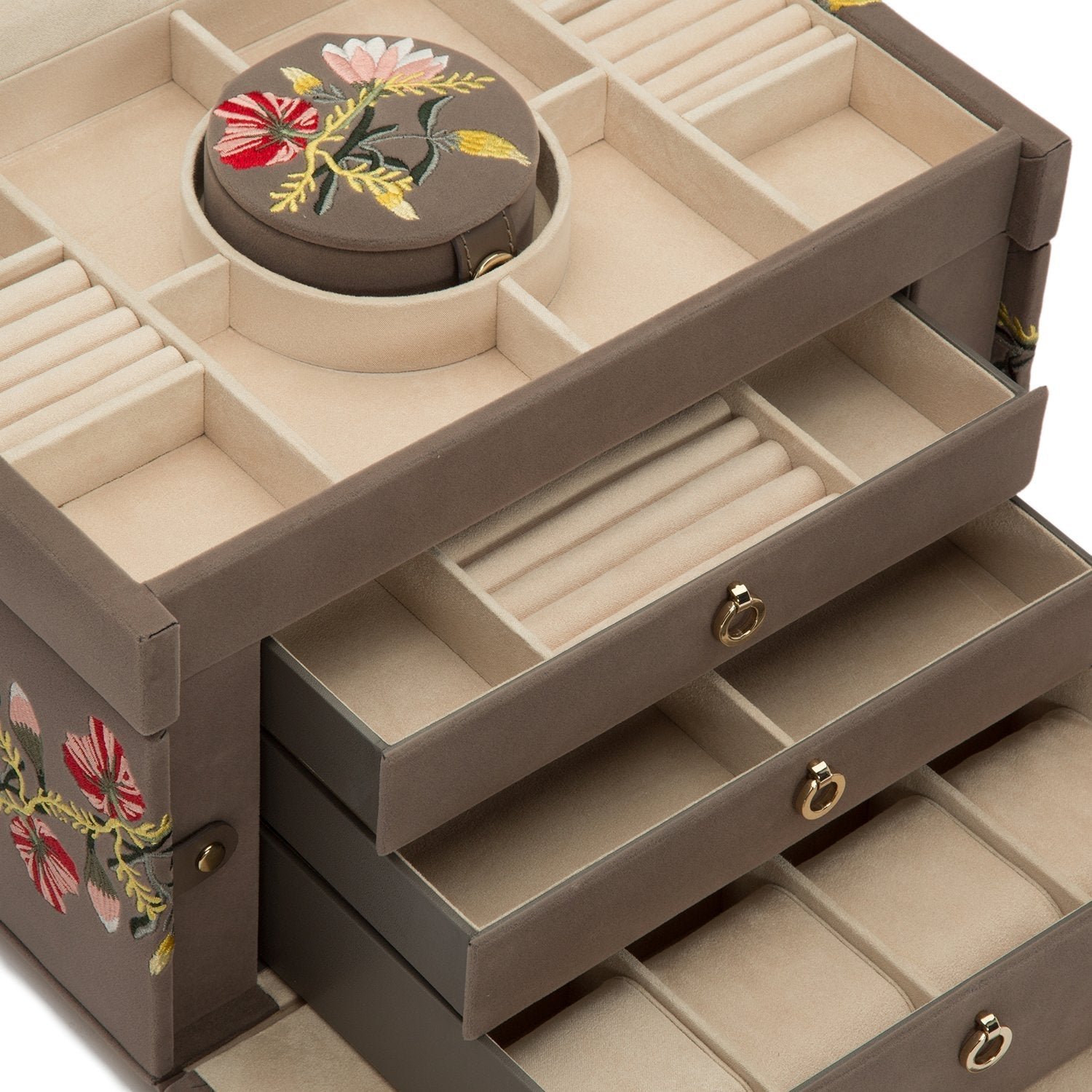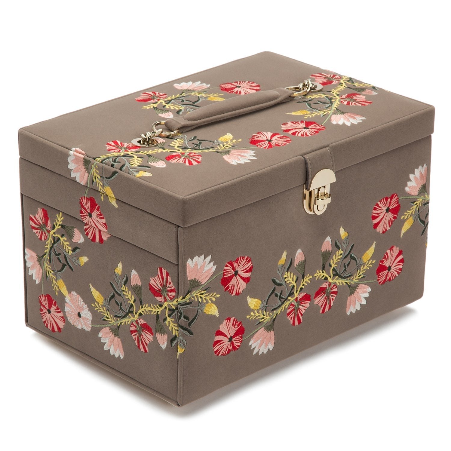 Fresh faced and fun, Zoe is sophisticated but playful. The Large case’s soft mink body highly embroidered with classic floral designs is as beautiful as its accessories inside. Includes mink velvet exterior, LusterLoc interior, pale gold hardware, and removable mini travel piece.